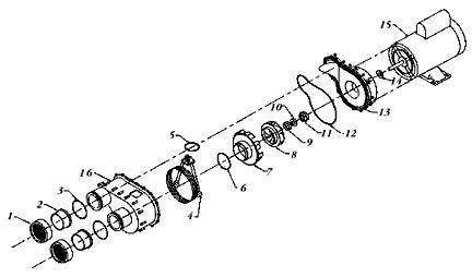 The wet portion of a pump is called the pump wet end or pump volute. It consists of a face plate with a piston seal O-ring, back plate, impeller, shaft seal, and a cover.