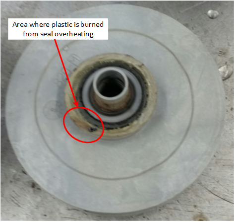 When the motor is energized, the impeller is rotating inside the pump housing at 3,450 or 1,725 rpms. If air is present and trapped in the pump housing, the friction between the two faces of the shaft seal can reach over 200°F in seconds. Unlike water, trapped air cannot cool down the seal surfaces. The rubber jacket holding the stationary seal will be damaged due to the extreme heat. The heat transferred to the impeller will deform the plastic. In most cases, the seal will leak. Once the pump is disassembled the damage is clear and obvious. -