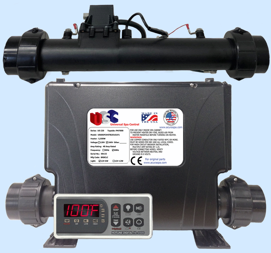 The Universal Spa Control (USC) for $299.00 is a reliable spa control that fits all hot tubs and is a direct replacement for all spa brands. The USC spa pack is equipped with a 5500W (5.5kW), 4000W (4kW), or 3000W (3kW) spa heater. The USC hot tub heater is protected by a reliable pressure switch and two digital temperature sensors. Consumers can easily add to their existing spa plumbing our patented Automatic Air Bleeder to 100% protect the USC spa heater from dry fire. The USC hot tub pack is also equipped with a heavy duty contactor outside of the digital control board to drive the USC spa heater. All of our spa digital control boards are conformably coated to protect the electronic circuitry against the moisture inside portable spa cabinets. Our digital spa circuit boards are 100% made in the USA. Our USC control board can operate up to 4 water pumps and our smart touch spa side controller is made with reliable membrane switch technology used for years in the aerospace industry. Our energy efficient digital spa controller turns the heater on only when necessary, thus saving hot tub owners hundreds of dollars per year on their electrical bill. In addition, our digital spa controller contains Freeze Guard to prevent your hot tub freezing and costing thousands in repairs. We also incorporate Hi-Limit Sensor to protect your spa from overheating (and saving your pumps and plumbing). The Universal Spa Control can power spas and hot tubs all over the world with 120V, 60Hz and 240V, 50Hz single or three phase power. From $324.95, replace all Balboa spa controls, even the balboa hot tub control with M7 technology. If your hot tub is powered by a Balboa water Group heater, call us we can make you a replacement. Some spa manufactures use Gecko spa controls or even Spa Builders controls, call us for a replacement. We offer direct replacement to all controls made by ACC spa packs also known as Applied Computer Controls, smart touch 1000, smart touch 1500 or smart touch 2000.We can build equivalent heater to United Spas controls, Waterway digital controls are using the same polymer enclosure as the USC. We can also make you a control to replace Brett Aqualine and Catalina controls or Even CRL spa pack. spa manufacturers do not make controls or hetaer they purchase them from spa pack mfg. is any of the following spa manufacture, the USC can power and control your hot tub. Alp Spas, Affordable Spas, Action Spas, Hot Spring Spas, Sundance Spas, Vita Spas, Maax Spas, Saratoga Spas, Clear Water Spas, Caldera Spas, LA Spas, Dolphin Spas, Diamante spas, Sensation Spas, PDC Spas, Hawkeye Spas, Morgan Spas, US Spas, Cal Spas, Advanced Spa Designs, Thermospas, Aquamonde Spas, Aquamonde Hot Tub, Free Flow Spas, Viking Spas, Sweetwater Spas, Aspen Spas, Nordic Spas, Apollo Spas, United Spas, Life Spas, True Force Spas, Country Leisure Manufacturing, Catalina Spas, Caribbean Spas, Curtis Spas, Hydro Spas, Spa Manufacturers, Atlas Spa, Pacific Marquis, Beachcomber, Aris Spas, Tuff Spas, Sun Ray Spas, Leisure Bay Spas, Master Spas, Blue Ridge by Jacuzzi, South West Industries, BullFrog Spas, Sunset Spas, Paradise Spas, Turbo spas, Spa and Tub Manufacturer, Sunquest Spas, Spa Crest, Spas by Design, Spa Plus, QCA Spas, South Pacific Spas, Anton Spas, Charisma Spas, Sunrise Spas, Bahamas Spas, Santa Barbara Spas, Safari Spas, Bradford Spas, US Spas, Four Wind Spas, Millennium Spas, Seaside Spas, Icon Spas, Keys Backyards, Hot Tub Factory, Gulf Cost Spas, Gatsby spas, Emerald Spas, Blue Falls Mfg, Aber Hot Tubs, Aqua Mystique Spas, Aqua 4 Fun Spas, Aquamarine Spas, Tiger River Spas, Aquatique Industries, Australian Spas, Baja Spas, Blue Water Spas, Classic Spas, Clipper Spa Manufacturer, Clear Water Spas, Caldera Spas, Watking Spa Manufacture, Hot Spring Spas, Royal Spas, La-Z-Boy Spas, Fort Wayne Spas, Esther William Spas, Coast Spas, Water Edge Spas, Cal Spas, Cal Spa, Rio Swim Spas, Diamond Back Spas, Pacific Pool and Spas, Artesian Spas, Izzi Manufactuing, Jacuzzi, Seven Seas Spa, Monalisa Spas, California Cooperage Spas, Coleman Spas, Caldera Spas, Swim Spa Manufacturers, Strong Spas, Aries Spas, Artic Spas, Roberts Hot Tub, Alp Spas/Associated Leisure Products, Bullfrog Spas, Carribbean Spas, Country Leisure Spas, Curtis Spas, D. M. Industries, Dakota Spas, Diamonte Spas/Sensation Spas, Dimension One Spas, Dolphin Spas, Goodlife Spas, Grecian Spas, Hawkeye Spas, Islander Spas, ITT Industries/HydroAir (Europe), Jetpool (Brazil), Leisure Spas/Sedona Spas, Life Spas, Lifespring Spas, Marathon Spas, Mountain Springs Spas, Orozco International Spas, Pacific Fiberglass, Pacific Pool and Spas (Canada), Phoenix Spas, Platinum Spas, Seacard Pool and Spas, Sequoia Spas, Sunbelt Spas, Sunquest, ThermoSpas, US Tooling Spas, United Super Spas, Vortex Whirlpool Systems, Inc. and many others. Spa manufacture submit their spas for testing under UL standard 1563 for US, CSA for Canada and CE for Europe.